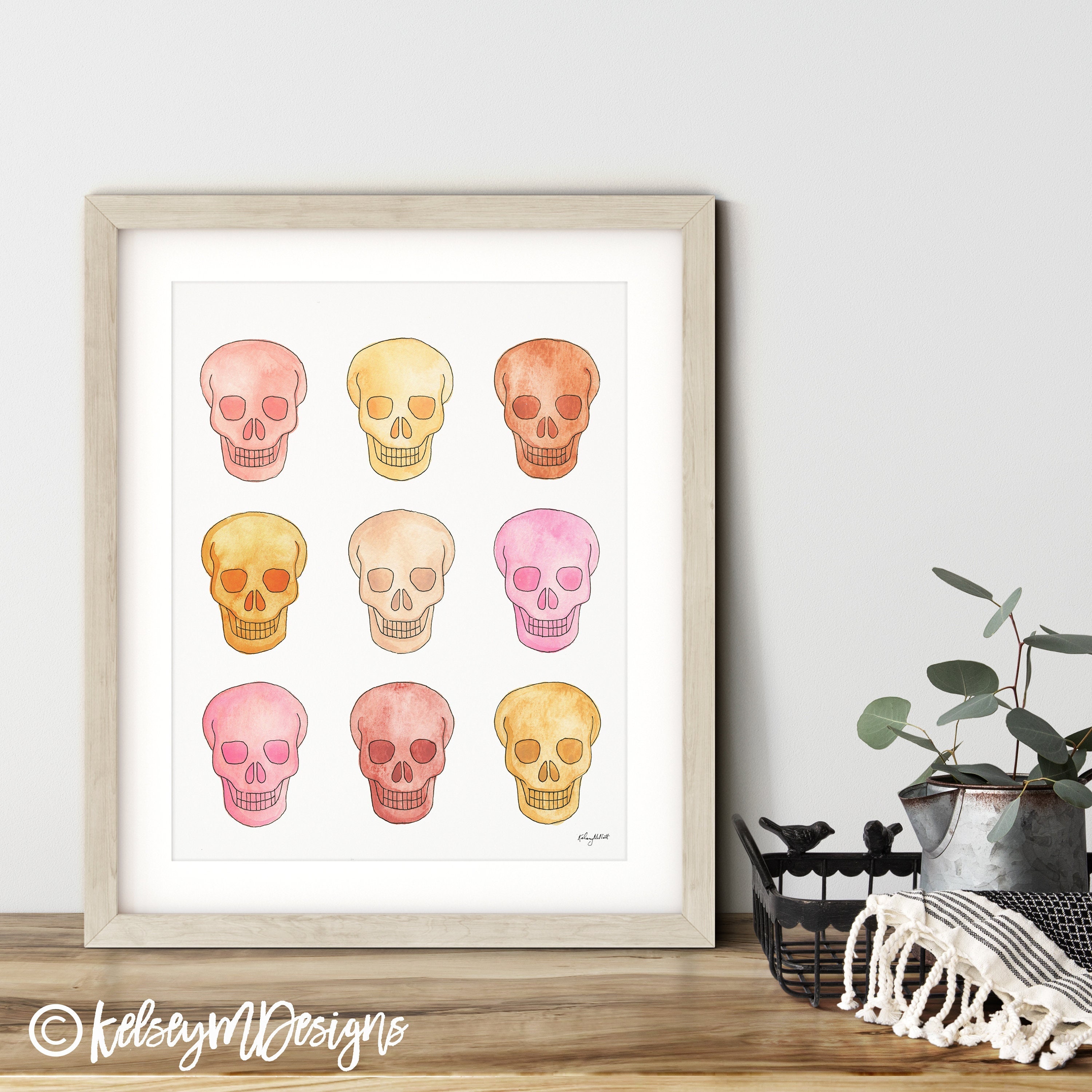 Pink Skulls Art Print • Fall Decor Wall Art • Watercolor Painting