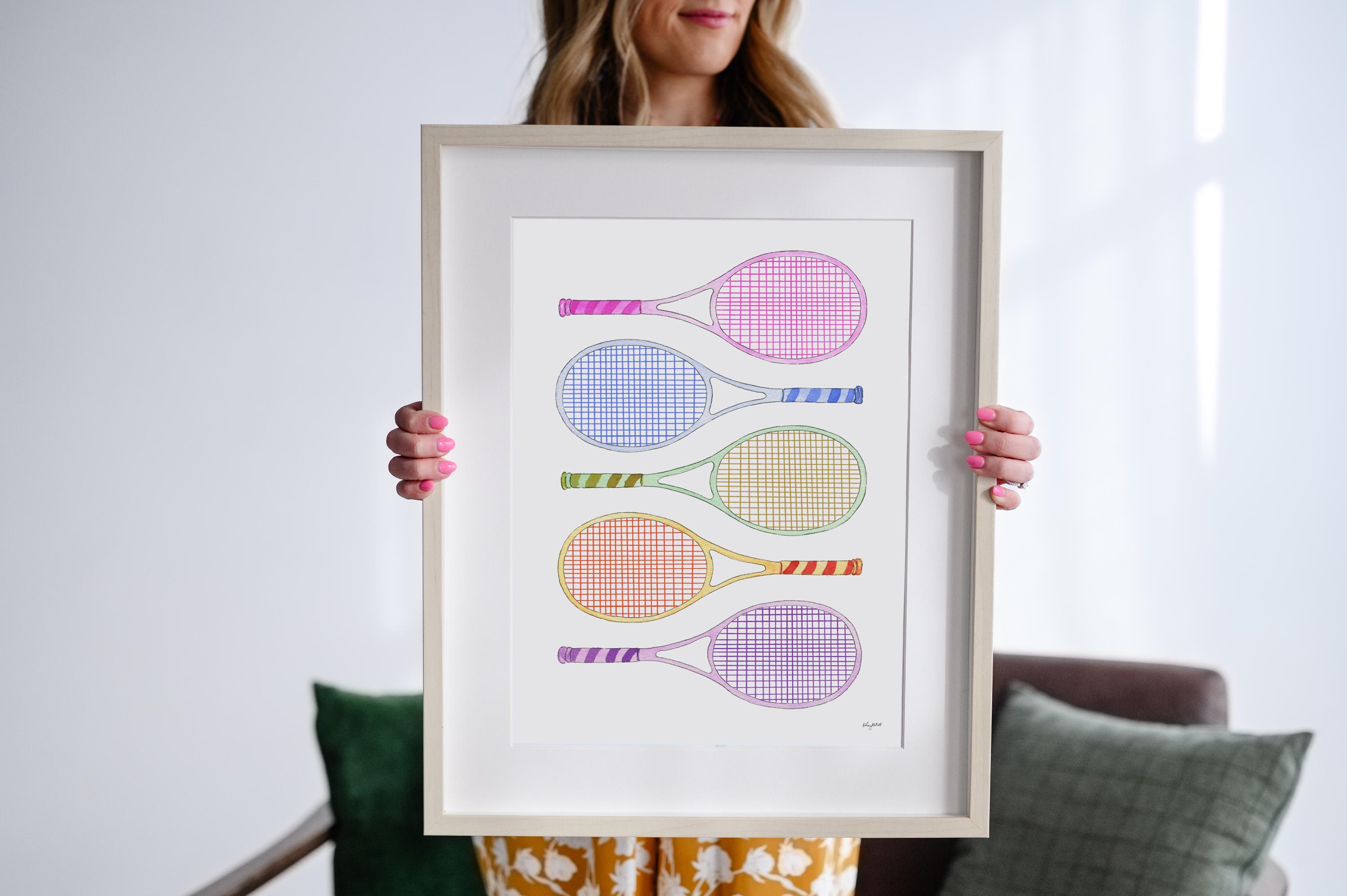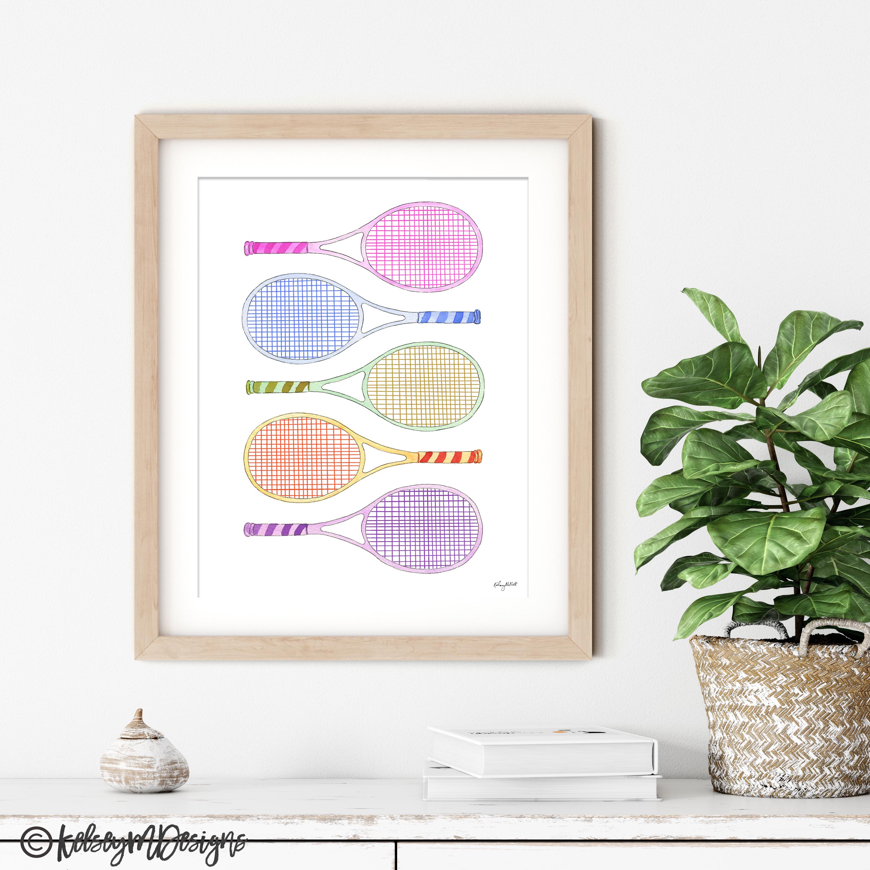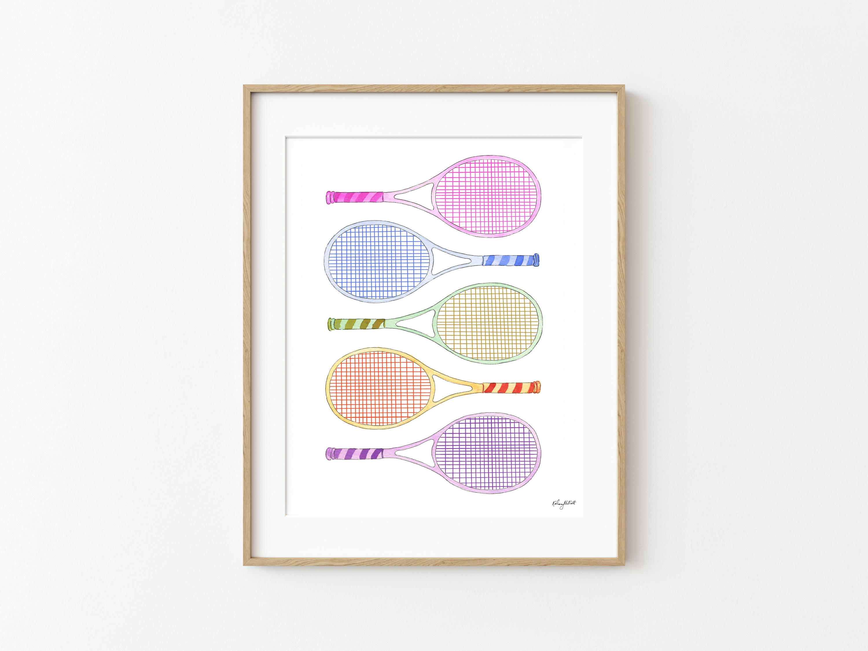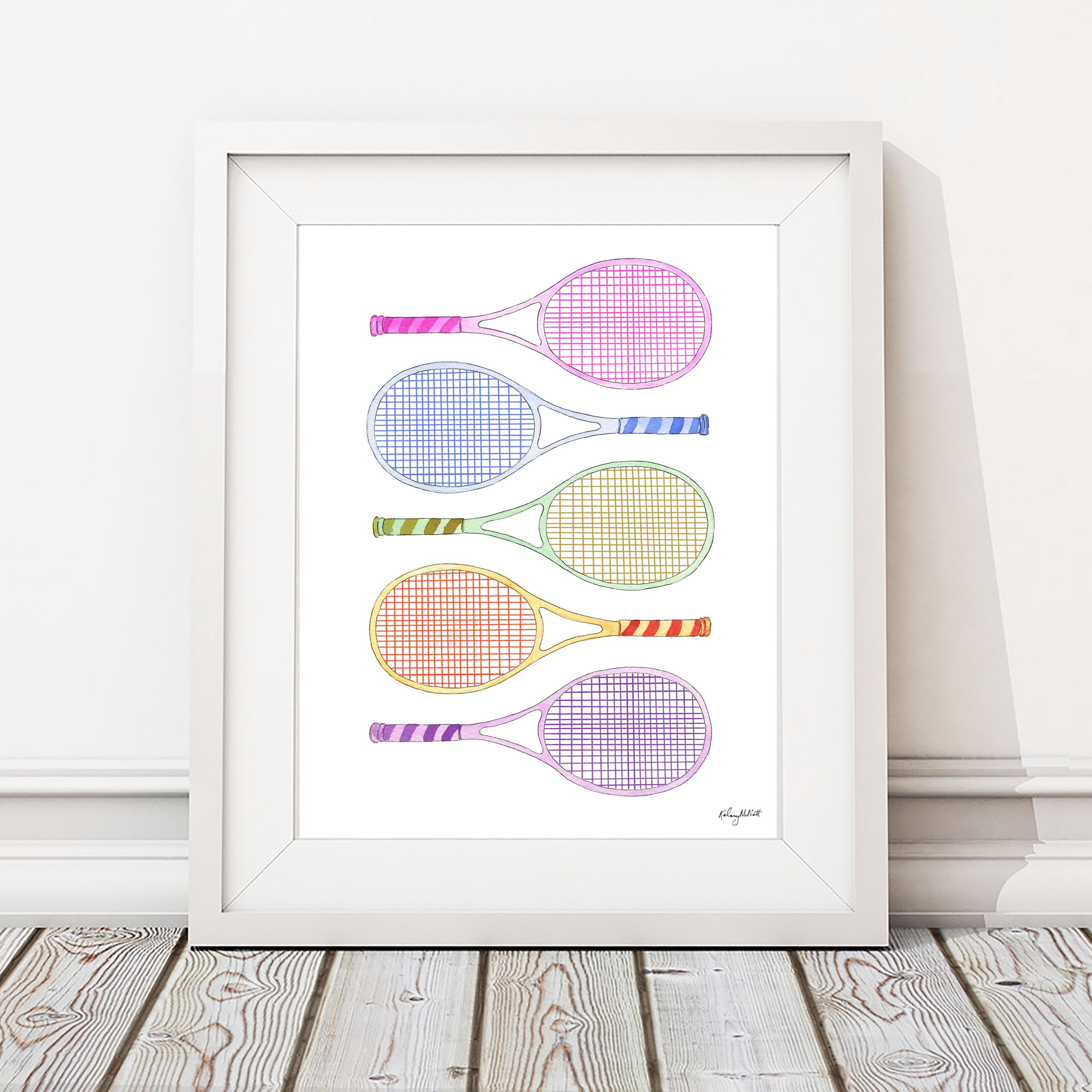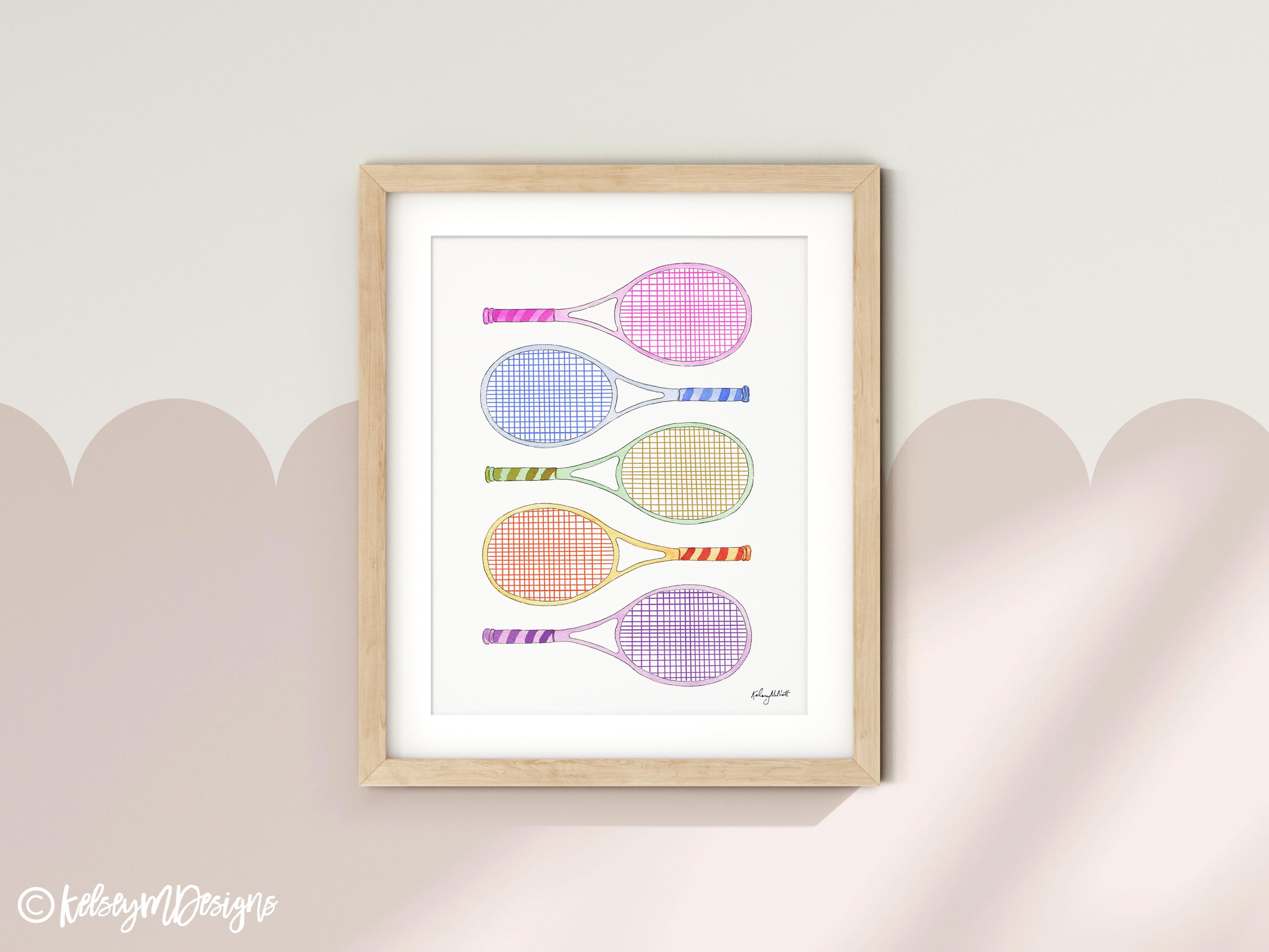 Bring a burst of color to your child’s room with this colorful tennis rackets art print! The bright watercolor design adds a fun, sporty touch to any kid’s bedroom, playroom, or nursery. Perfect for young tennis fans and playful spaces alike.
